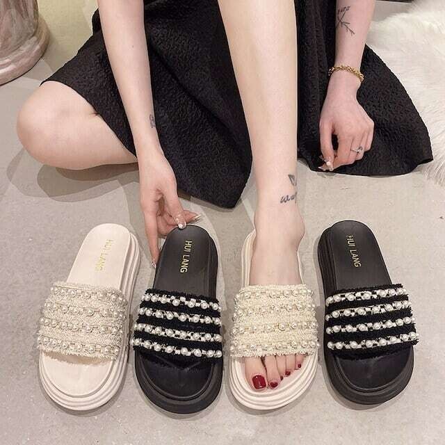 パール付きサンダル フラットサンダル スリッパサンダル カジュアル ガーリー ママコーデ E215
